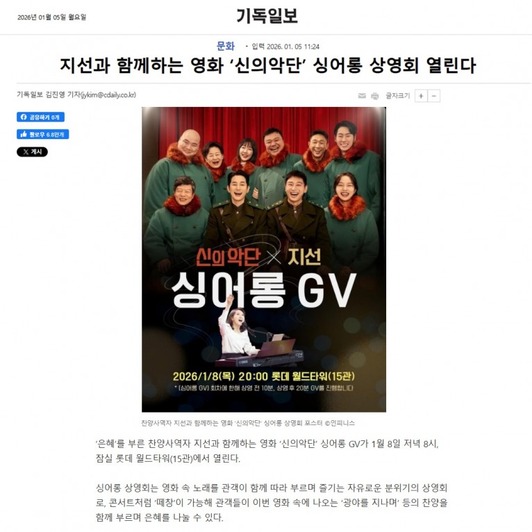 [기사] 지선과 함께하는 영화 ‘신의악단’ 싱어롱 상영회 열린다(기독일보)