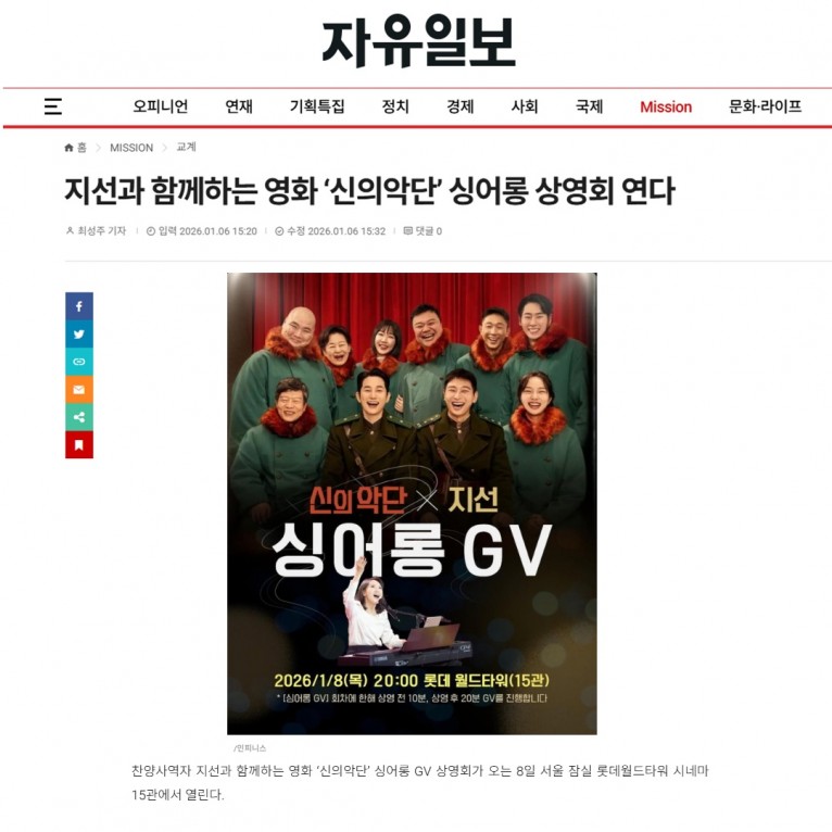 [기사] 지선과 함께하는 영화 ‘신의악단’ 싱어롱 상영회 연다(자유일보)