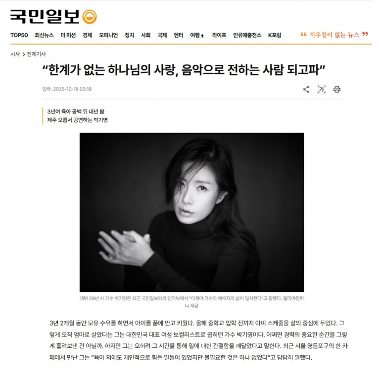 [기사] 박기영, “한계가 없는 하나님의 사랑, 음악으로 전하는 사람 되고파”(국민일보)